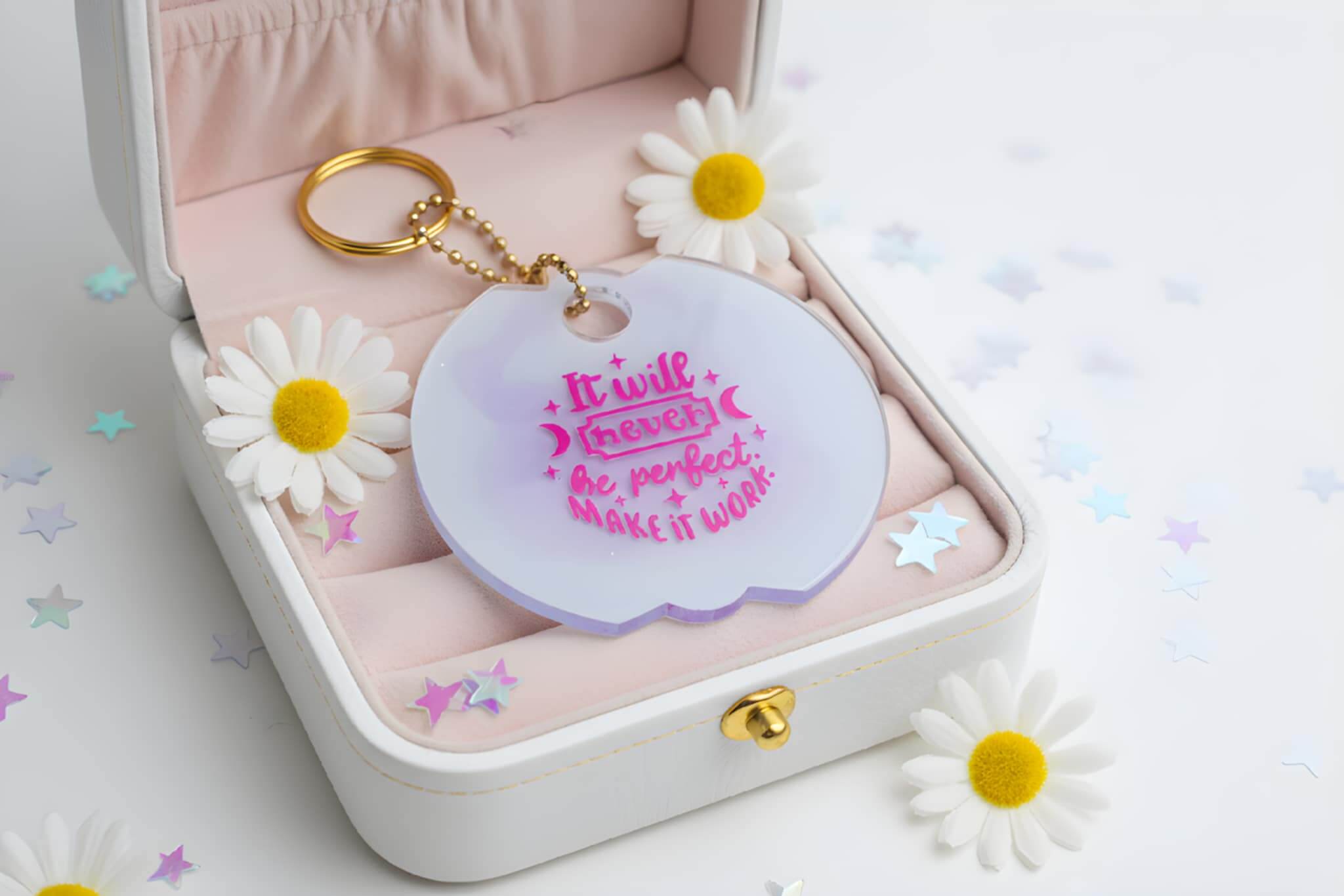 Een handgemaakte sleutelhanger met de inspirerende tekst “It will never be perfect. Make it work.”Een speelse, warme reminder om door te gaan – perfect als lief cadeautje of voor jezelf ✨