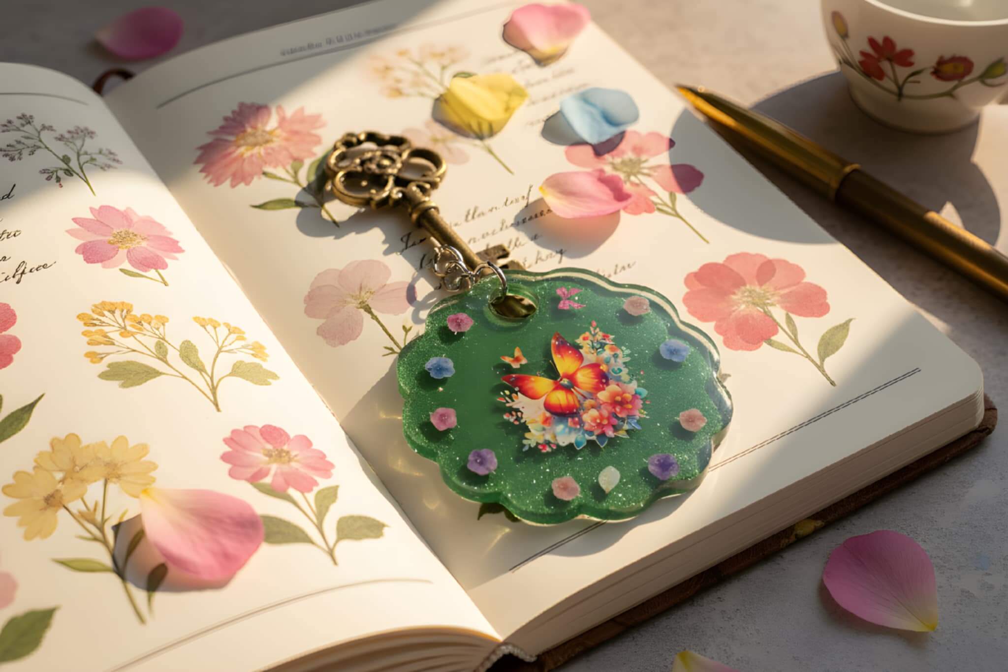 Een handgemaakte UV-resin sleutelhanger met een sierlijke vlinder en bloemen.Uniek, speels en vol natuurmagie – perfect voor aan je sleutels of als lief cadeautje 🌿🦋