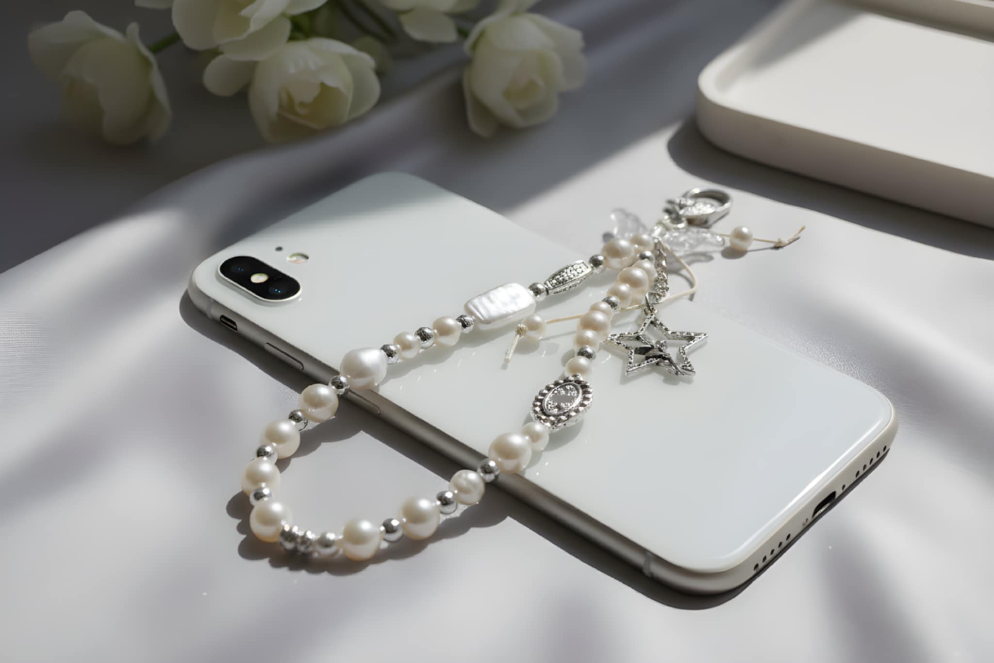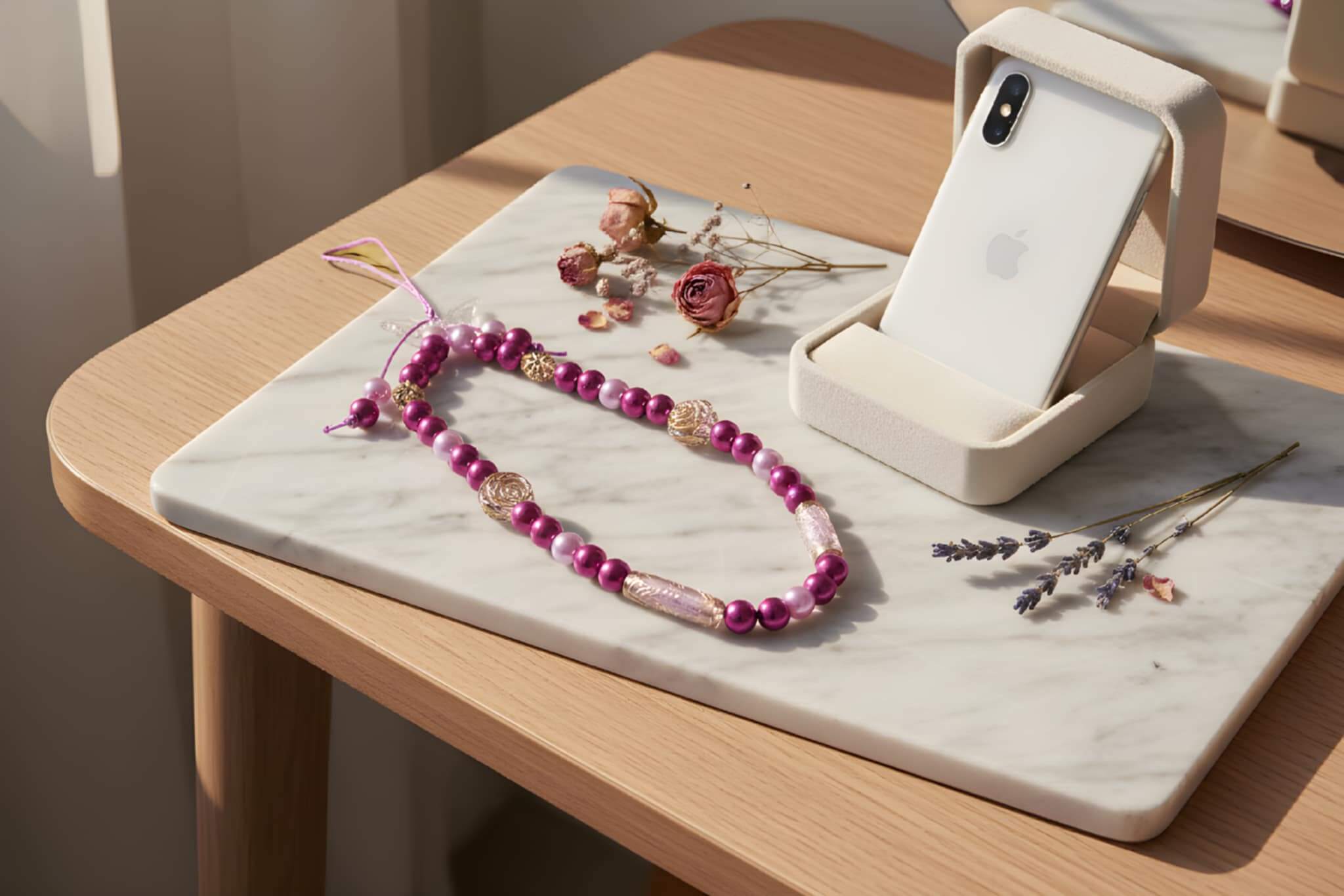 De zachte tinten paars, parelwit en transparant doen denken aan zonlicht op het water en zand tussen je tenen. Elk detail is zorgvuldig gekozen en met de hand geregen, waardoor elke strap uniek is. Geen massaproductie, maar een klein kunstwerkje dat jouw telefoon laat stralen 🌊💙