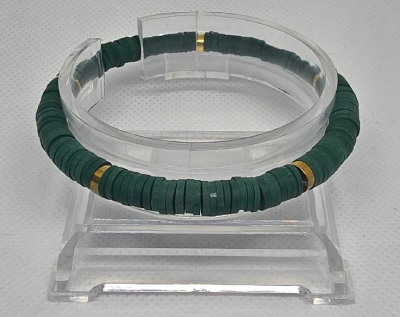 Klei armband gemaakt van elastiek met blauw en goudkleurige kralen.